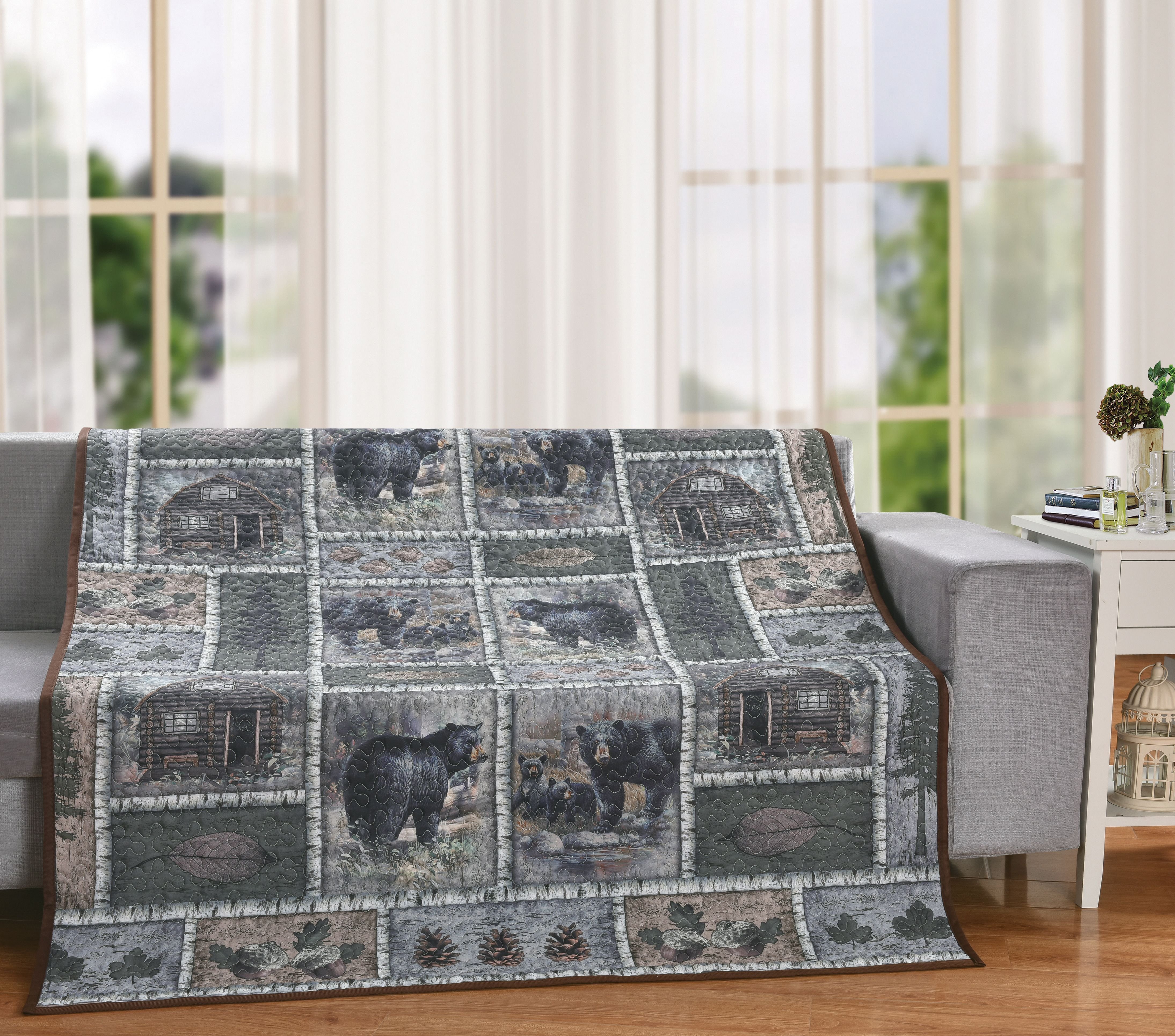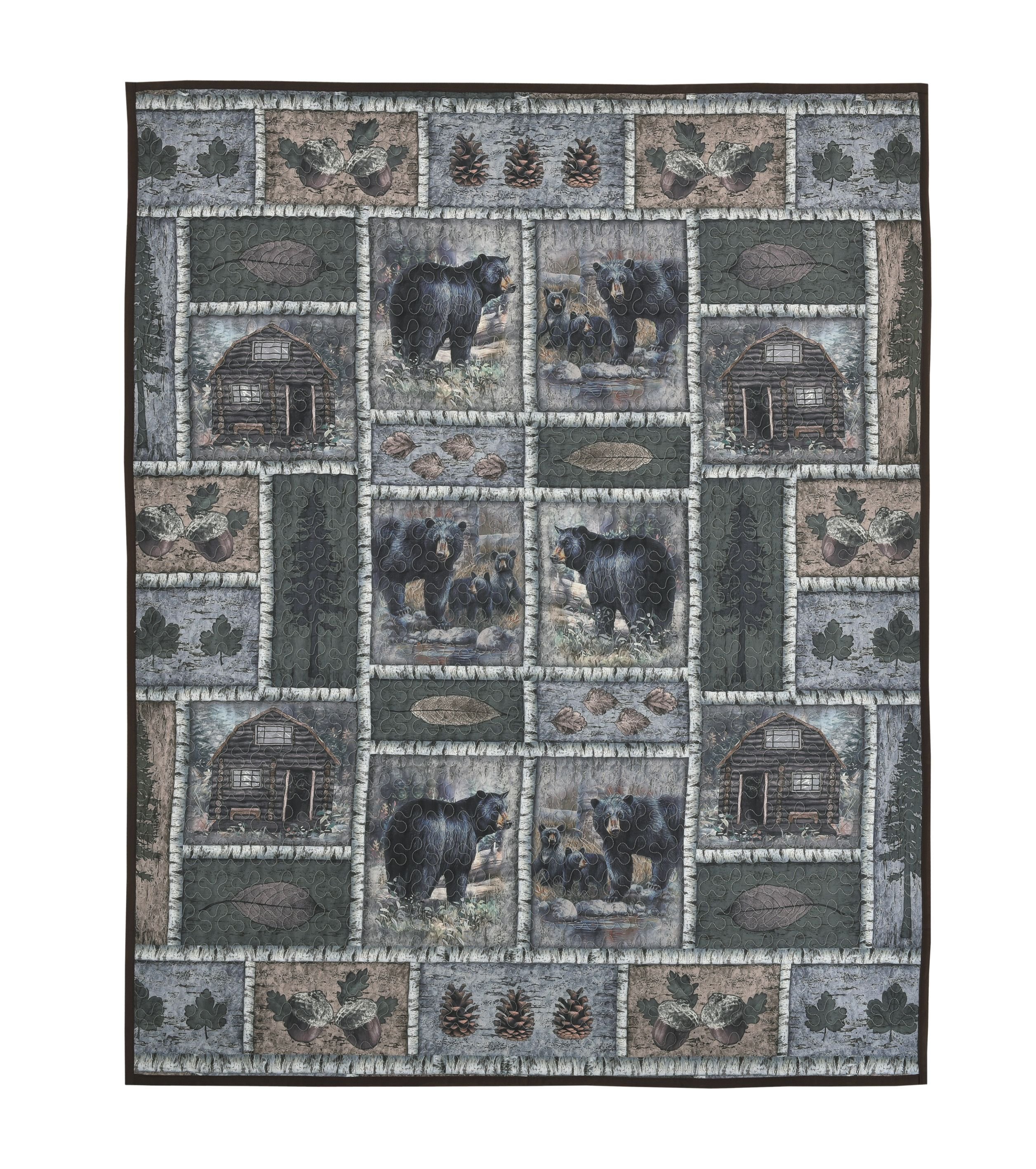Bring the rustic beauty of the wilderness into your home with this Black Bear Lodge Quilt. Featuring a patchwork design of black bears, cozy log cabins, pinecones, oak leaves, and woodland details, this quilt is perfect for adding warmth and charm to any cabin, lodge, or nature-inspired bedroom. Crafted from soft microfiber polyester with detailed quilting, it combines durability, comfort, and a timeless outdoorsy look.
