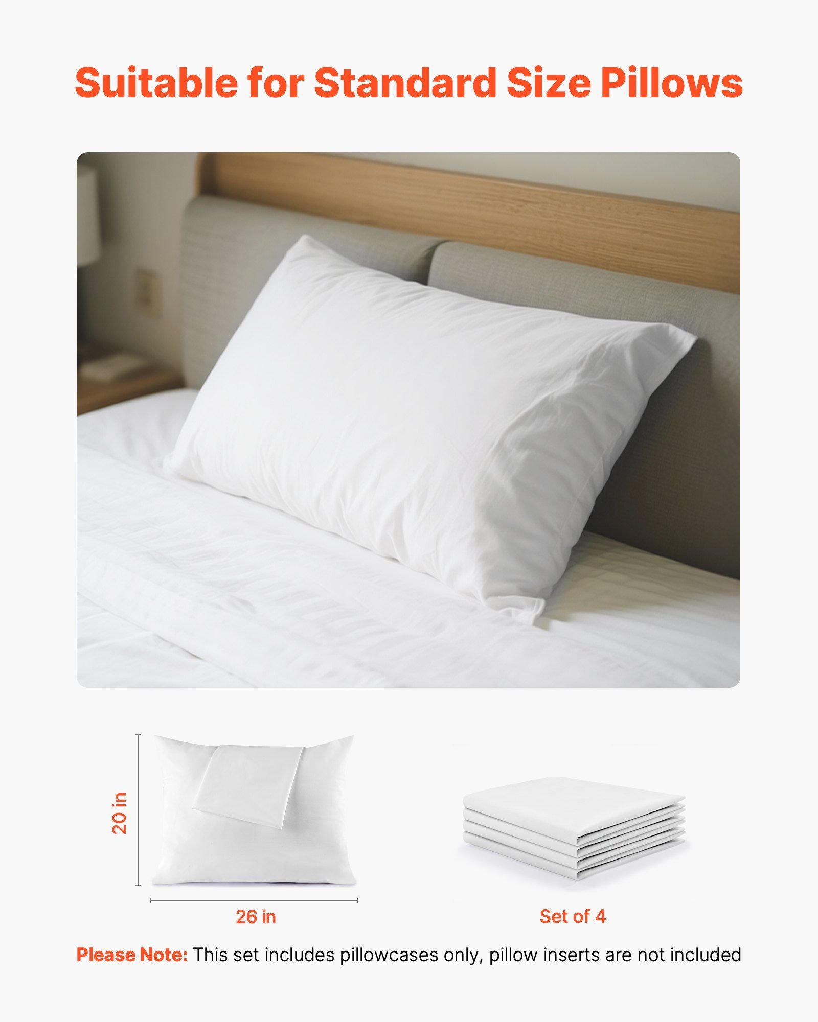 1.Pillow Protector 4-Pack: This 4-pack pillow protector set is tailored for standard-size pillows, each measuring 20 x 26 in, fitting most bed pillows. (Note: This set includes pillow covers only, pillow inserts are not included.)